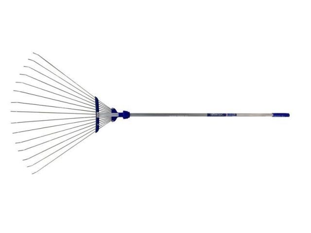 Конструкция рабочей части - раскладная, фиксатор - цанговый, пластиковый. Тип граблей - веерные проволочные, кол-во зубьев - 15. Ширина в разложенном виде - 550мм.